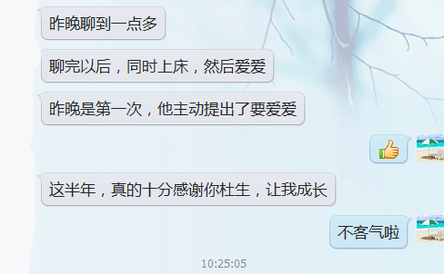 根据我的调查,那个男人比妻子小四岁,也就是说比我小六岁。这么说来也倒是个小白脸了,让我不禁发笑。据妻子所说,一开始只是工作上的业务往来,很正常的往来,随着接触的频繁,慢慢的联系起来,生活上的关心和工作上的烦恼,开始有好感,但并未有太多的暧昧,可能就像有句话说的,不要长时间和一个人聊天,会产生依赖。这样断断续续的聊天持续了两年之久,我竟然忙于工作中,对此没有一点的察觉。