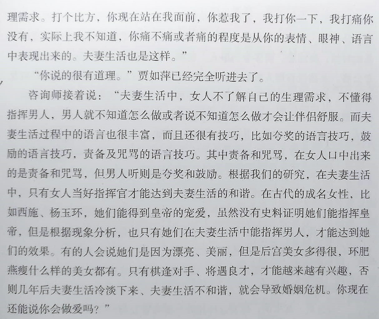 书中这点确实戳到了我的痛处,我从未在周围的朋友中提起过这种事情,上一次和老公 应该是一年前了吧,我还记得他好像喝了酒,微醉,然后突然就爬我身上来了,可能是有点醉吧反正进行到到一半就没有下文了,没再继续过。以前好像没这样过,这是第一次也是最后一次,到现在有一年多了。中间好像他提过一次他想要问我有没有买防护品,我说这种东西怎么能要女人来准备?后来他就没说话了。