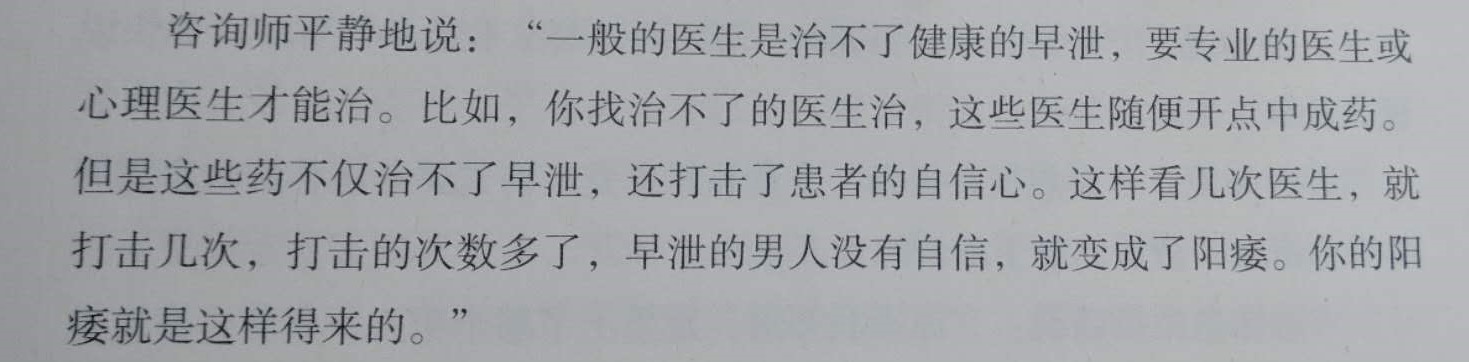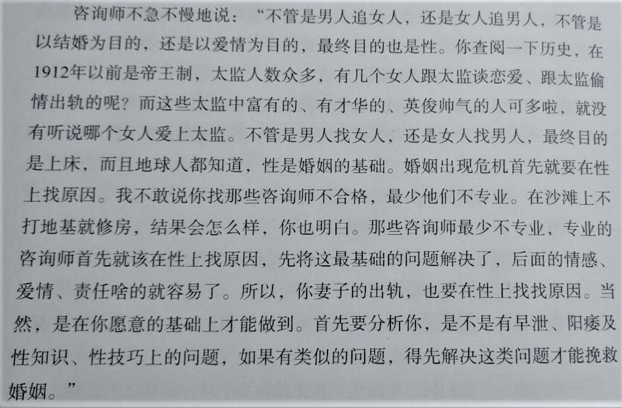 咨询师不急不慢地说:“不管是男人追女人,还是女人追男人,不管是以结婚为目的,还是以爱情为目的,最终目的也是性。你查阅一下历史,在1912年以前是帝王制,太监人数众多,有几个女人跟太监谈恋爱、跟太监偷情出轨的呢?而这些太监中富有的、有才华的、英俊帅气的人可多啦,就没有听说哪个女人爱上太监。不管是男人找女人,还是女人找男人,最终目的是上床,而且地球人都知道,性是婚姻的基础。婚姻出现危机首先就要在性上找原因。我不敢说你找那些咨询师不合格,最少他们不专业。在沙滩上不打地基就修房,结果会怎么样,你也明白。那些咨询师最少不专业,专业的咨询师首先就该在性上找原因,先将这最基础的问题解决了,后面的情感、爱情、责任啥的就容易了。所以,你妻子的出轨,也要在性上找找原因。当然,是在你愿意的基础上才能做到。首先要分析你,是不是有早泄、阳痿及性知识、性技巧上的问题,如果有类似的问题,得先解决这类问题才能挽救婚姻。”